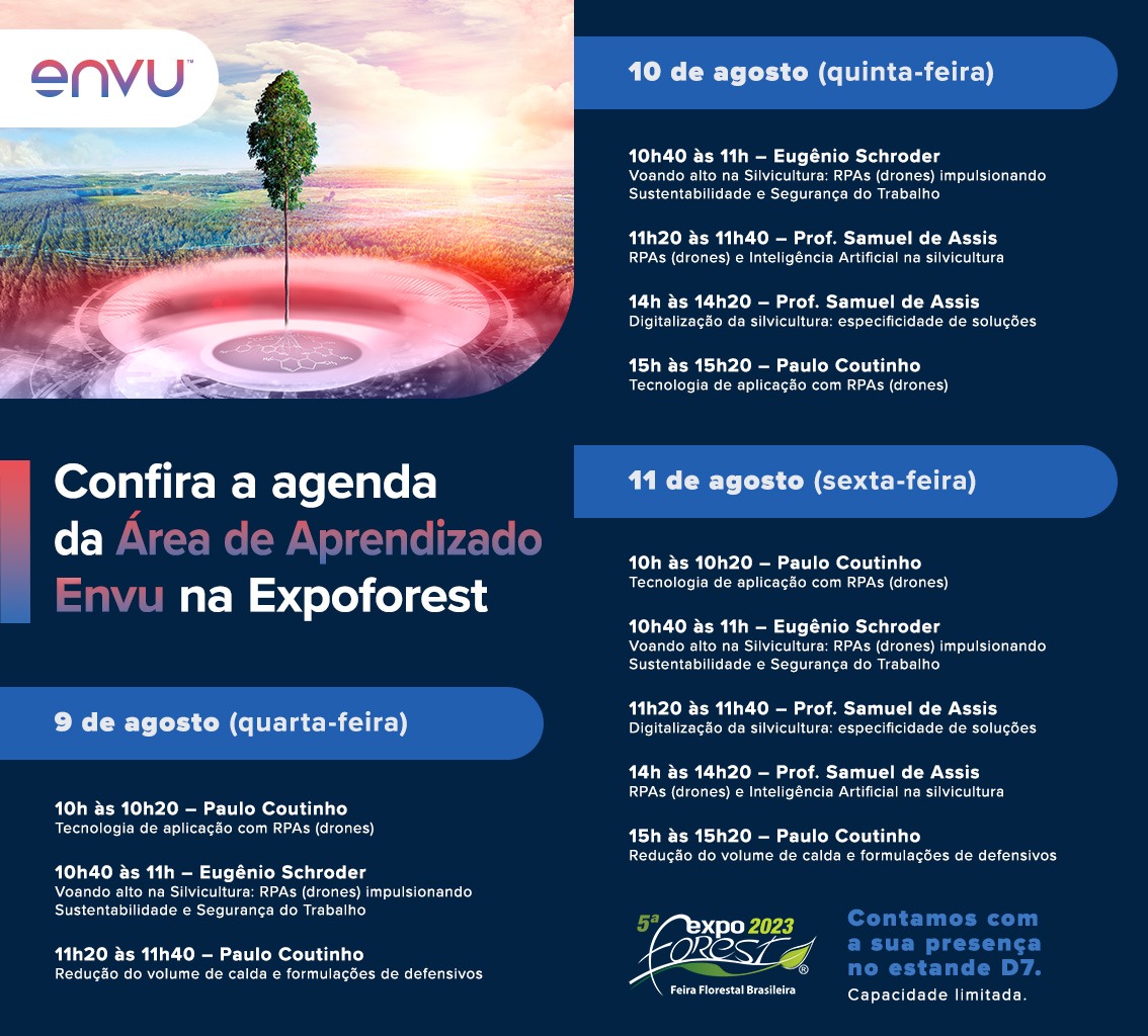 As vagas para aulas e palestras da Área de Aprendizado Envu são limitadas. Os interessados podem conferir a programação e realizar as inscrições de forma antecipada diretamente no estande da empresa. Já em relação ao livro “Silvicultura de Precisão”, haverá unidades sendo vendidas durante o lançamento da publicação no dia 9 de agosto, a partir das 14h.