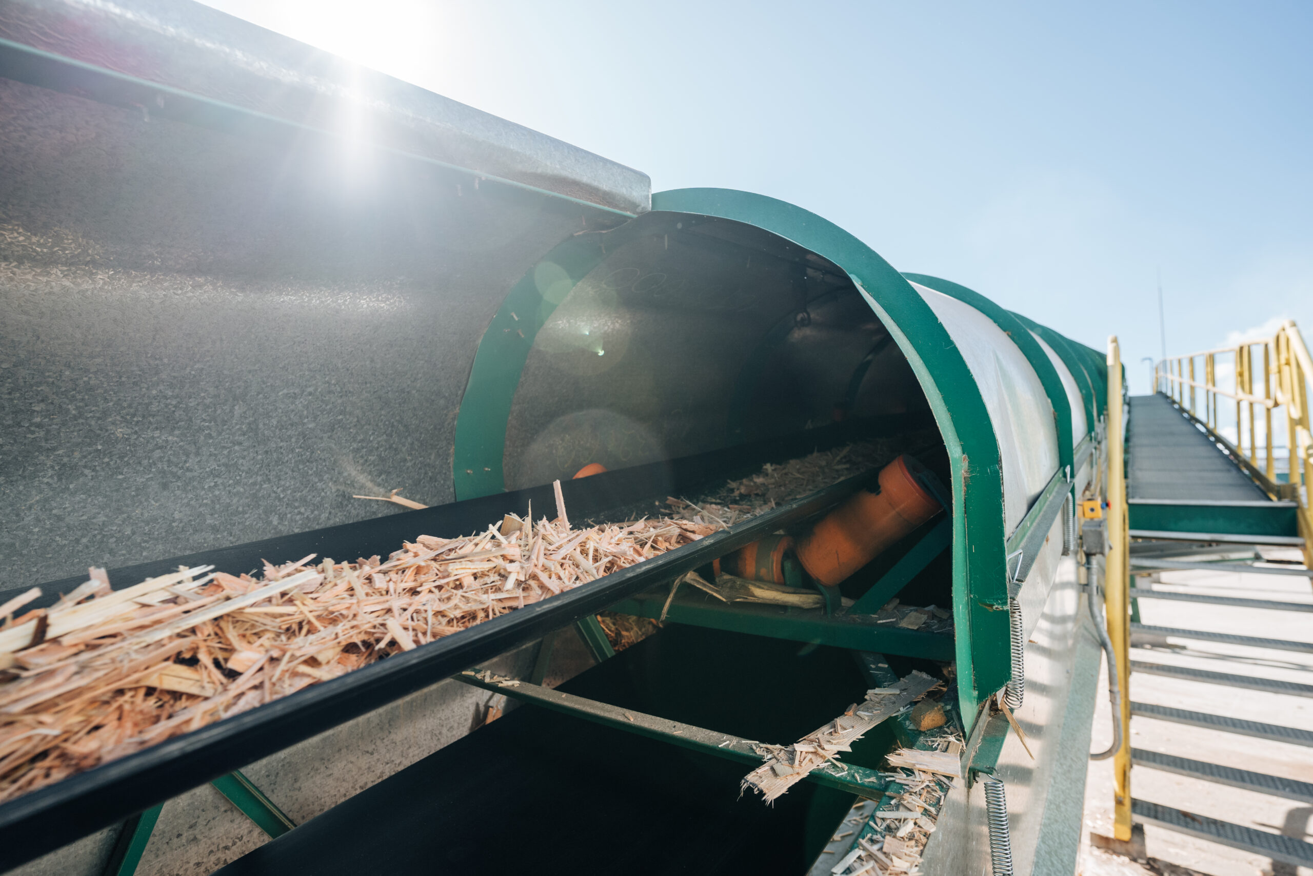 Para esse processo é feito o descascamento e desapontamento das toras, gerando um resíduo chamado pela Lumin de core. Esse resíduo verde é transportado e picado antes de ser utilizado como combustível para a fábrica.